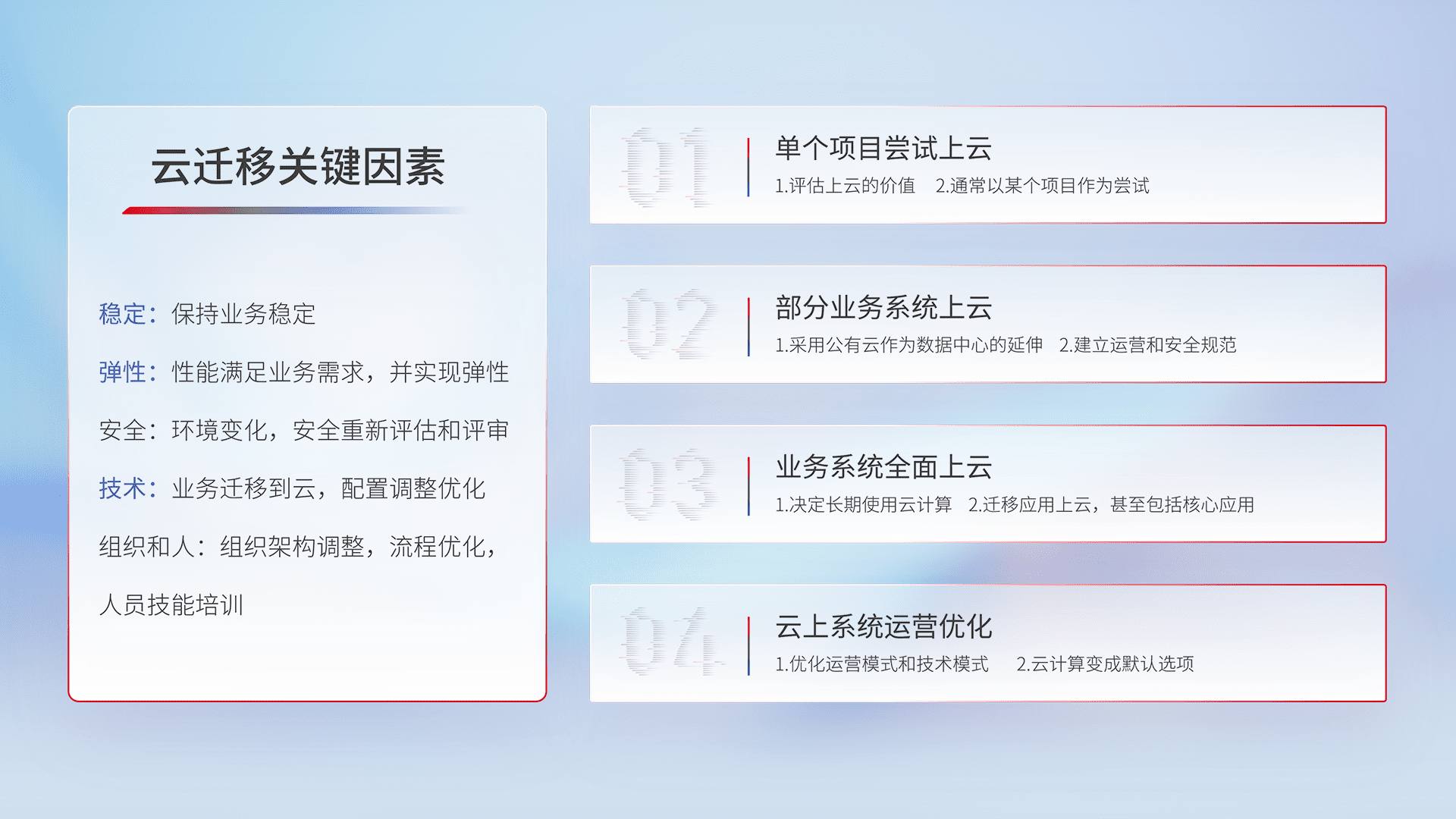 结合实际业务,,从规划设计、、云平台选型、、云原生改造、、、数据迁移、、、、集成交付,,,迁移全过程为客户识别最佳上云路径,,做好风险识别管理,,设计网络架构、、、身份权限、、、安全审计合规、、、操作审计、、、、日志审计、、、监控告警策略、、、多站点容灾设计等,,对云上基础设施进行整体规划,,,提升IT治理水平,,以满足弹性、、、高可用、、高性能的需求。。。。