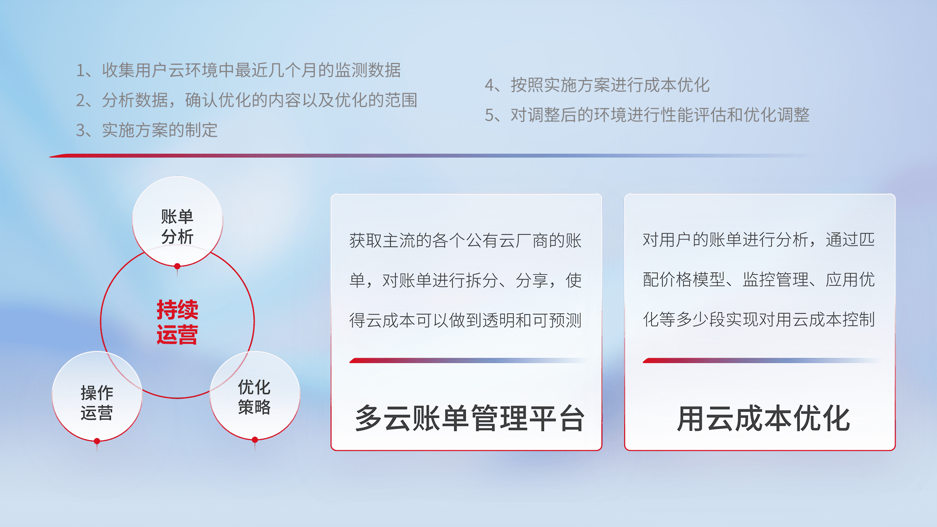 通过多云纳管,,,,以统一的资源数据模型把客户的云资源进行抽象和封装,,,,进而实现对多云资源的统一操作,,,,保障云资源管理的可靠性、、、、稳定性与可用性。。量身定制化运维内容,,配置、、、开发运维、、、、补丁管理、、、备份、、、、监控、、、、认证和访问管理、、、审计和日常巡检等,,保障在用云过程中的可靠度,,稳定度以及高可用率。。。。